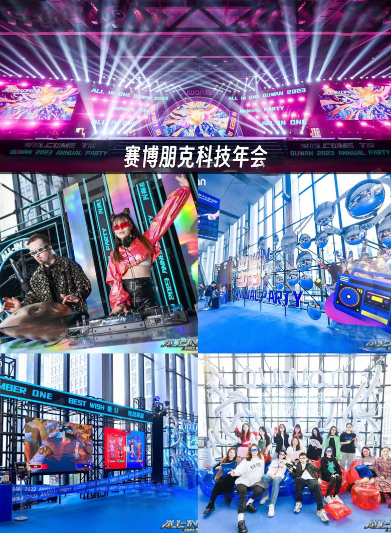 这种年会主题以蓝紫冷色调为主,运用极富律动感的电子音乐,鲜艳迷幻的荧光色系,搭配霓虹光感的绚彩繁丽……光与电完美结合,